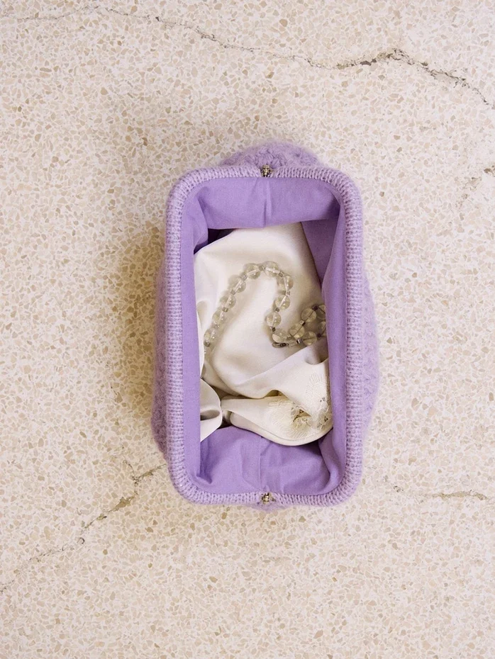 Dekorativ clutch heklet nedenfra og opp i puffmasker, med firkantet bunn og strikket kant rundt clutch-frame. Kombinasjonen av Double Sunday og Tynn Silk Mohair gir et mykt, lett og eksklusivt uttrykk. Clutchen fores og monteres til slutt.
