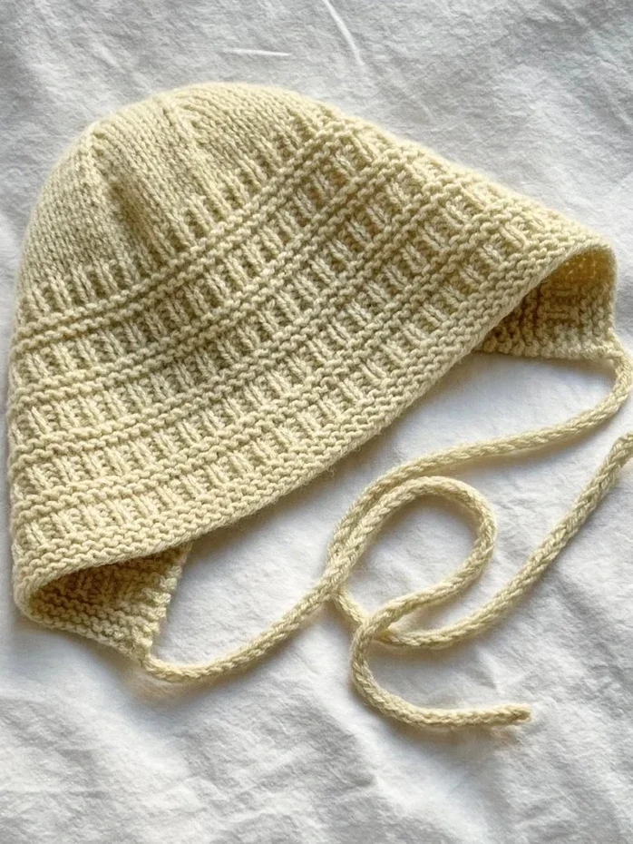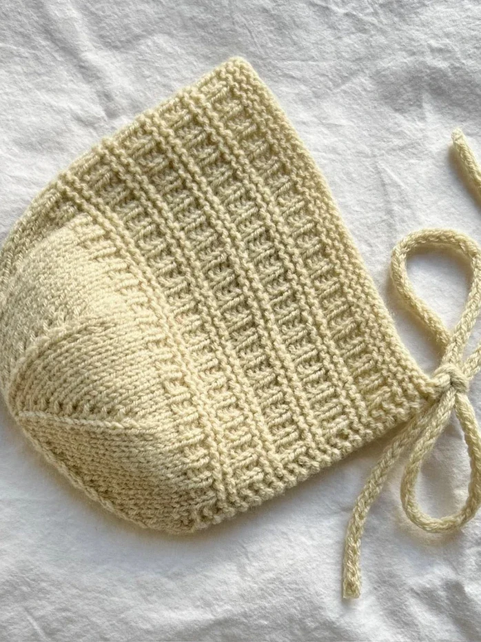 Sorgenfri kyse Light strikkes frem og tilbake på pinnen i strukturstrikk fra pannen og bakover. Deretter strikkes bakhodet i glattstrikk rundt på settpinner med fellinger. Til slutt strikkes en i-cord snor i hvert hjørne av kysens nedre kant.