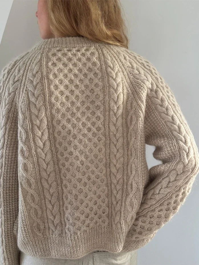 Flettemønstrene og raglanøkningene vises i diagrammer, slik at du får god hjelp i alle steg av oppskriften. Først økes det til raglan og forstykkenes halsutringning formes vha. vendepinner. Deretter strikkes det raglanøkninger, og etter det strikkes bakstykke/forstykker og ermer ferdig for seg.
