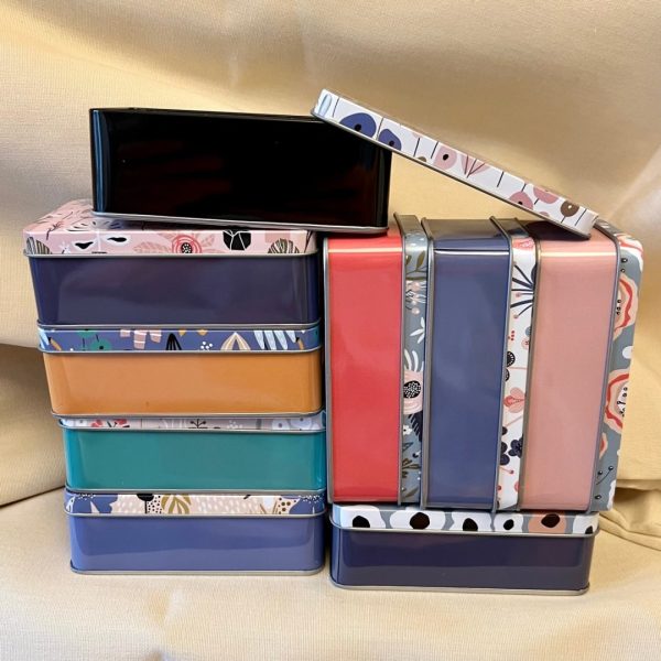 Ass. farger Medium stor metallbokser med løst lokk til oppbevaring. Mål: 11,5 cm x 7 cm x 4 cm