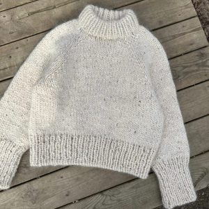 Materialer: 250 (250-300) g Double Sunday fra Sandnes Garn (50 g = 108 m) strikkes sammen med 75 (75) g Tynn Silk Mohair fra Sandnes Garn (25g = 212 m)