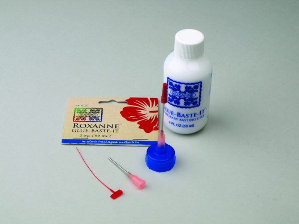 Roxanne Glue-Baste-it er et vannoppløselig pH-nøytralt lim. Det følger 2 spisser på 1″ og 1,5″ og det gir mulighet for dosering av lim i bitte små “klatter”. Den er gjennomsiktig og flekker ikke. Limet klister med det samme og tørker på 3-5 minutter. Forsvinner v/ vask med såpevann, selv etter bruk av dampstrykejern.