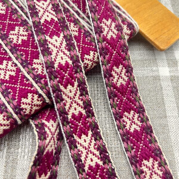 Ullbånd – koftebånd «Haugtussa», rosa og lilla. 25 mm