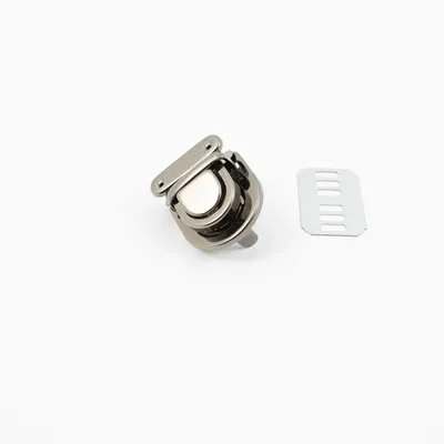 Veskelås i metall. Festes gjennom stoffet med en plate på baksiden. Toppen klemmes fast rundt kanten på veskelokket. Nikkelfri.